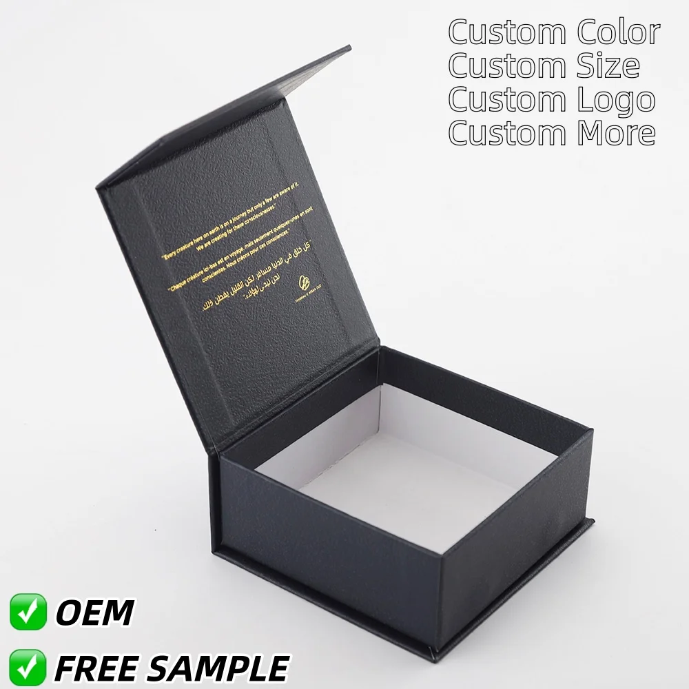 Book-style jewelry box with secure magnetic closure. Features a soft white EVA insert for perfect presentation, customizable spot color printing, and a choice of gloss or matte lamination for a premium finish.